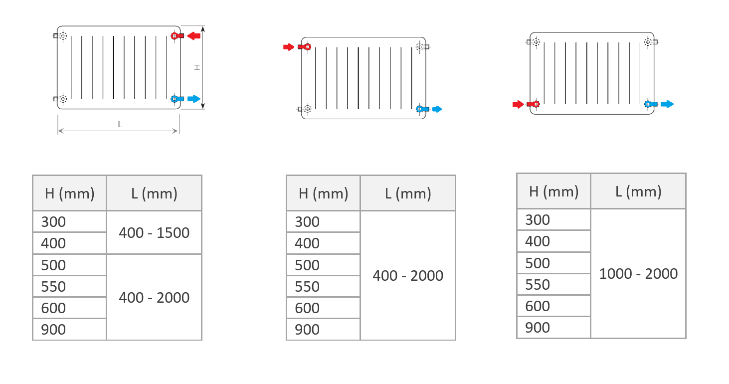 Models with this designation are suitable for areas with increased hygiene requirements. Thesa are Kompakt radiators without additional transfer area (convector), that type series 10 and 20. Type 20 is normally produced with a width of 65 mm. If required by the customer’s needs, it is possible to produce type 20 with a width of 100 mm. These radiators are then referred 20W. Hygienic radiators can also be supplied in the PLAN version, ie with a smooth front surface.