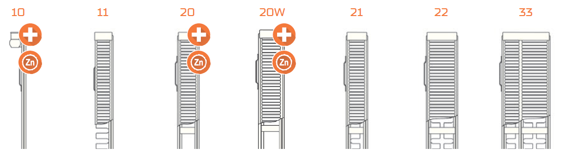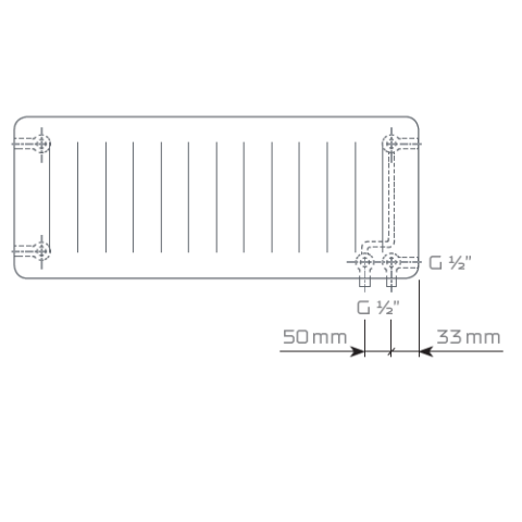Basic model range of radiators with a 6-point bottom connection in the middle of the body and a shaped panel with vertical channels. It includes a valve insert located on the right side. The radiator includes side covers and a top grille.